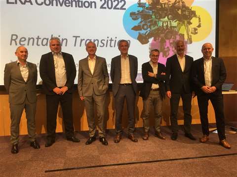 The new ERA Board, from left: Jürgen Küspert (bbi), Andy Wright (Sunbelt Rentals UK), Stéphane Hénon (Loxam), Xavier du Boÿs (Kiloutou), Pierre Nicola Fovini (Finanzauto), Arne Severin (Zeppelin Rental) and Martin Holmgren (Cramo Group).
