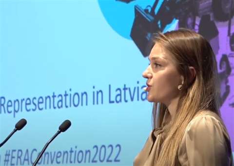A still from the ERA’s official video of the European Rental Convention 2022. Irena Švilpe, EU Commission Representation in Latvia, presents at the convention. (Source: ERA.)