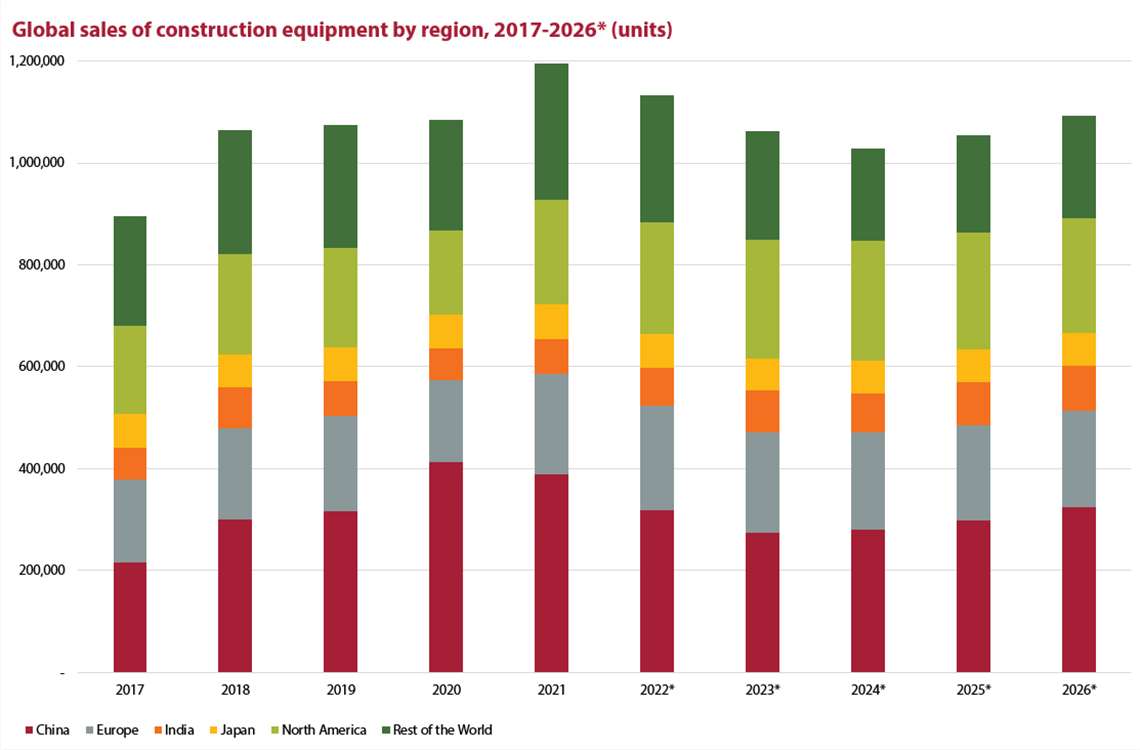 Sleight said, “Equipment sales in China have moved to a different rhythm to the rest of the world since the start of the Covid pandemic. China quickly put stimulus in place at the start of the global pandemic in March 2020. As a result it saw 30% growth in its equipment sales last year, to take the market to volumes which had not been seen for a decade.