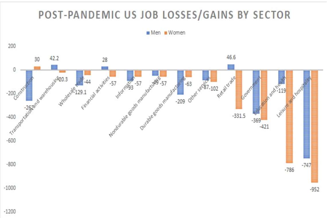 And add to that the fact that unlike the “man-cessions” of the 1970s which affected heavy industries such as construction and manufacturing, the sectors most affected by successive lockdowns have happened to be the service sector – restaurants, retail, childcare and education – where over half of employees are female.