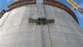 Structural Technologies/VSL required a specialized solution to install and tension steel post tension cables at four vertical concrete buttresses that anchored the tendons, each wrapping halfway around the tanks. The Hydro-Mobile mast climbers allowed the team to install the steel cables, use hydraulic jacks to stress the tendons and fill the ducts with cement grout. The platforms were used for three operations, including the installation of the post tension strands, stressing the strands and grouting work.