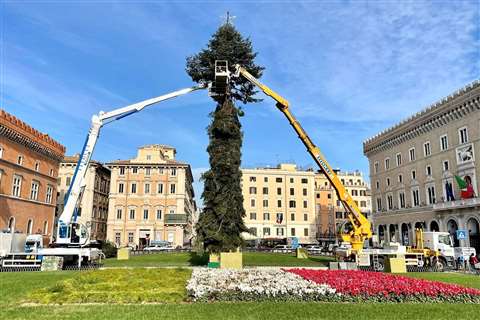 Pair of truck mounts erect Christmas tree and lights in Piazza Venezia
