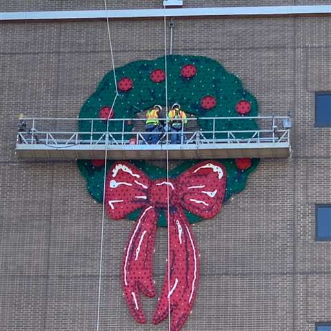 Western workers were lowered via a swing stage from the hospital’s roof to the wreath’s designated position on the side of the building where they installed 36 lag bolts and shields in the brick façade. The wreath, which was constructed in 16 sections, was then hoisted into position by the workers and secured. The project took two days to complete. Western workers will remove the wreath on January 6, and it will be stored onsite until next November.
